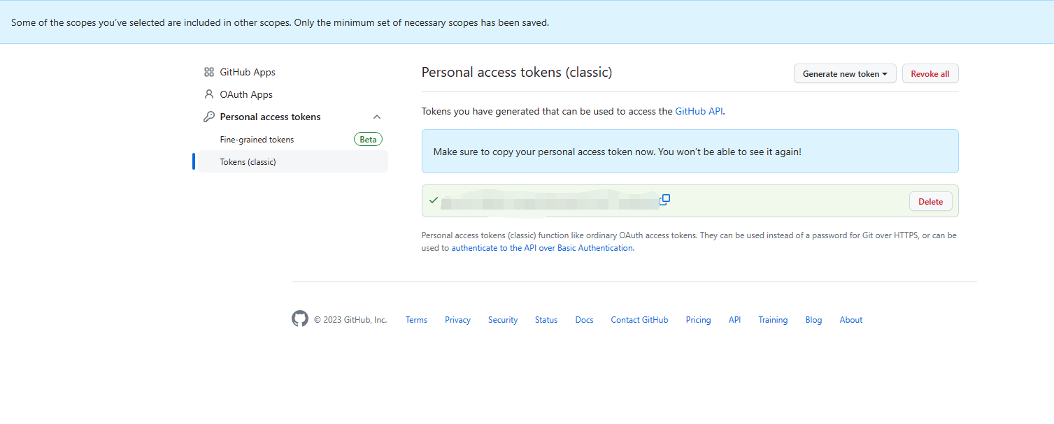 2.点击 Generate token 即可,注意,该密钥只在第一次生成时明文显示,请注意保存,后期要是忘了重新生成就行