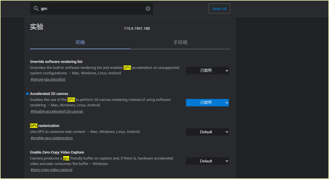 在搜索栏输入` edge://flags`跳转后输入GPU