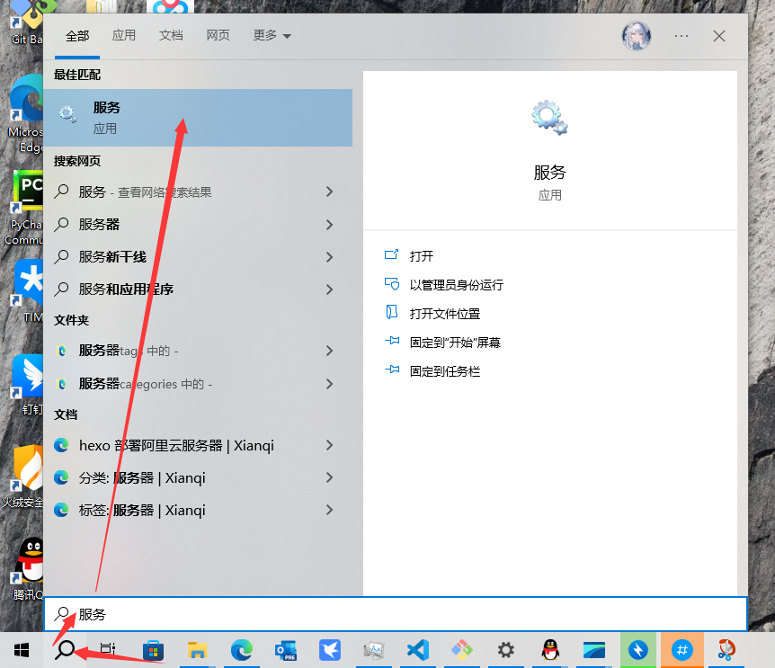 - 在任务栏点击搜索,输入服务,点击最佳匹配下的应用