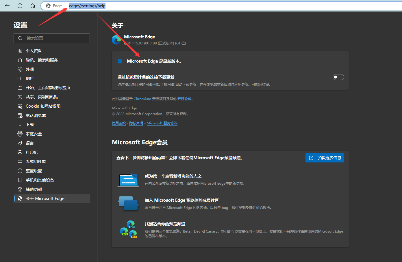 当然,如果想要恢复更新也比较简单,打开edge浏览器,在搜索栏中输入 edge://settings/help 就可以检查更新了